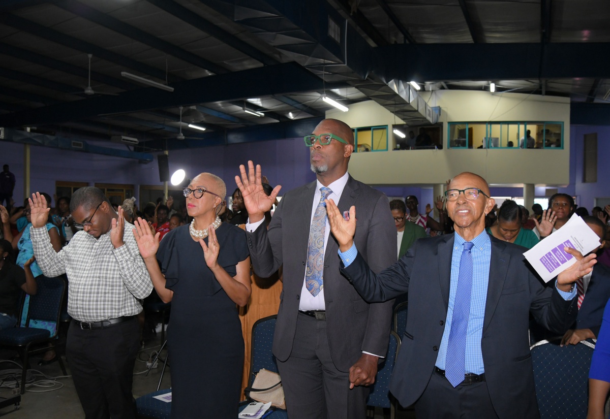Minister of Finance and the Public Service, Hon. Fayval Williams (second left), along with (from left) Chief Public Policy Officer, Public Procurement Commission, Jovell Barrett; Member of Parliament, St. Catherine South Eastern, Robert Miller, and Chairman, Public Procurement Commission, Milverton Reynolds, participate in the agency’s fifth anniversary thanksgiving service at Celebration Church in Portmore, St. Catherine, on Sunday (July 20).
