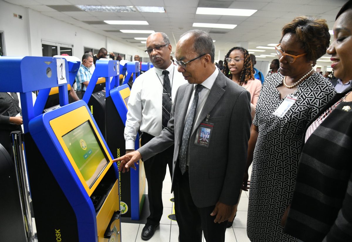 Minister of National Security, Hon. Dr. Horace Chang (second left), accesses the new Immigration/Customs (C5) Form at a kiosk at the Norman Manley International Airport (NMIA) in Kingston on Tuesday (September 5). Looking on (from left) are Chief Executive Officer of the Passport, Immigration and Citizenship Agency (PICA), Andrew Wynter; Permanent Secretary in the Ministry of National Security, Ambassador Alison Stone Roofe; and Chief Executive Officer and Commissioner of Customs, Jamaica Customs Agency (JCA), Velma Ricketts Walker.
