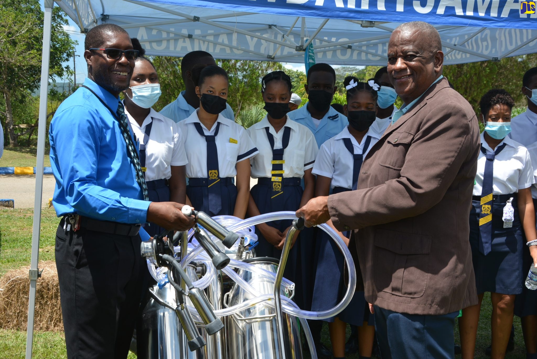 Minister of State in the Ministry of Agriculture and Fisheries, Hon. Franklin Witter (right), officially hands over a mobile milk machine to Principal of the Sydney Pagon Science, Technology, Engineering and Mathematics (STEM) Academy in St. Elizabeth, Milbert Miller (left), as students of the school look on. Occasion was the official handing over ceremony which was held at the school on Wednesday (March 23).