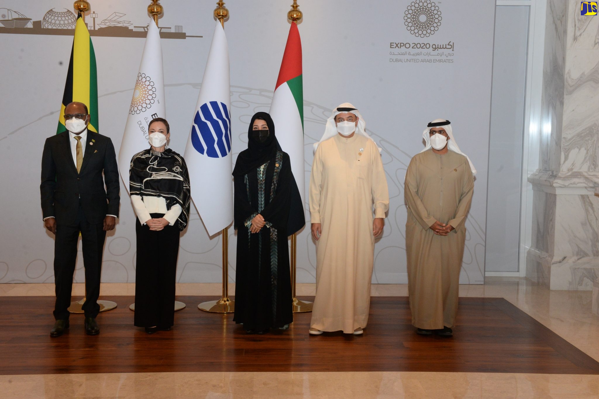Minister of Tourism, Hon. Edmund Bartlett (left), and Minister of Foreign Affairs and Foreign Trade, Senator the Hon. Kamina Johnson Smith (second left), with officials of the United Arab Emirates (UAE) during Jamaica’s National Day Flag Raising Ceremony at EXPO2020 Dubai on Friday (February 18).