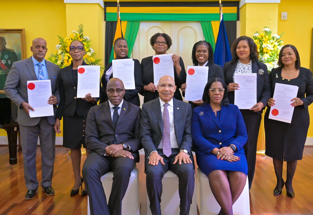 Governor-General, His Excellency the Most Hon. Sir Patrick Allen (seated centre); Chief Justice, Hon. Bryan Sykes (seated left); and President of the Court of Appeal, Hon Justice Marva McDonald Bishop (seated right), with members of the judiciary who were sworn in to higher offices at today’s (September 16) swearing in ceremony, at King’s House. They are from (left) Justice Kissock Laing; Her Honour Tracey-Ann Johnson; Her Honour Opal Smith; Justice Georgiana Fraser; Ms. Andrea Martin Swaby; Her Honour Christine McNeil and Ms. Maxine Jackson.