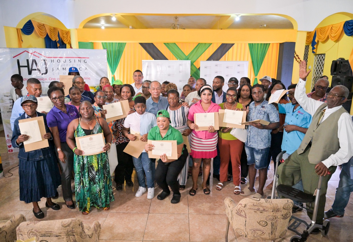 Land titles were distributed to these residents of Norwood in St. James, on August 11. With them are Prime Minister, Dr. the Most Hon. Andrew Holness (sixth left, back row), and Minister of National Security and Member of Parliament for the area, Hon. Dr. Horace Chang (sixth left, second row).