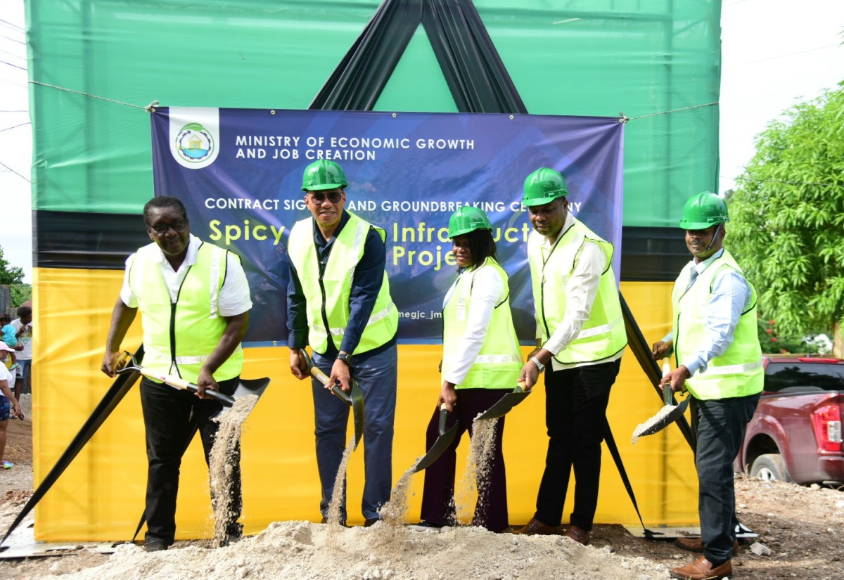 Prime Minister, Dr. the Most Hon. Andrew Holness (second left), officially breaks ground for the Spicy Grove Infrastructure Works Project in Oracabessa, St. Mary, on Wednesday (September 25). Also participating are (from left) Member of Parliament for St. Mary Western, Robert Montague; Permanent Secretary in the Ministry of Economic Growth and Job Creation, Arlene Williams (second right); Mayor of Port Maria, Councillor Fitzroy Wilson, and Managing Director for Southland Construction Limited, which will undertake the project, Raynard Hudlin.