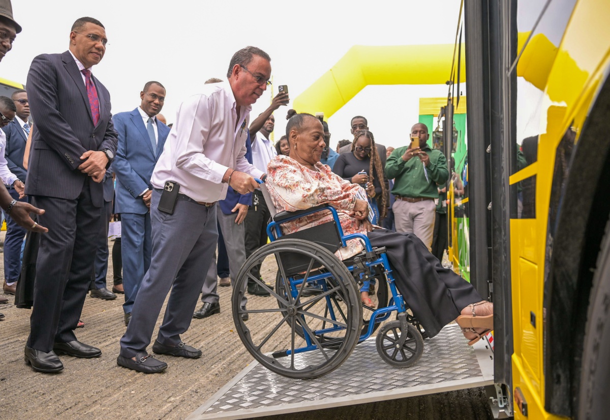 Prime Minister the Most Hon. Andrew Holness (left), and Minister of Finance and the Public Service, Dr. the Hon. Nigel Clarke (second left), observe as Minister of Science, Energy, Telecommunications and Transport, Hon. Daryl Vaz, assists President of the Combined Disabilities Association, St. Catherine, Christine Keene, in maneuvering her wheelchair onto a ramp affixed to one of the Jamaica Urban Transit Company’s new compressed natural gas (CNG) buses. The occasion was Tuesday’s (August 27) handover ceremony for the 100 new CNG buses acquired for the JUTC at the State entity’s Portmore Depot in St. Catherine.