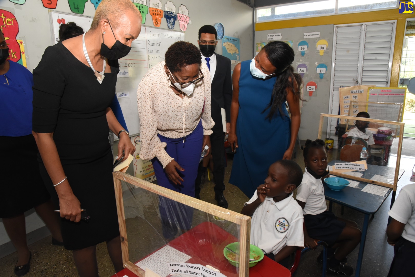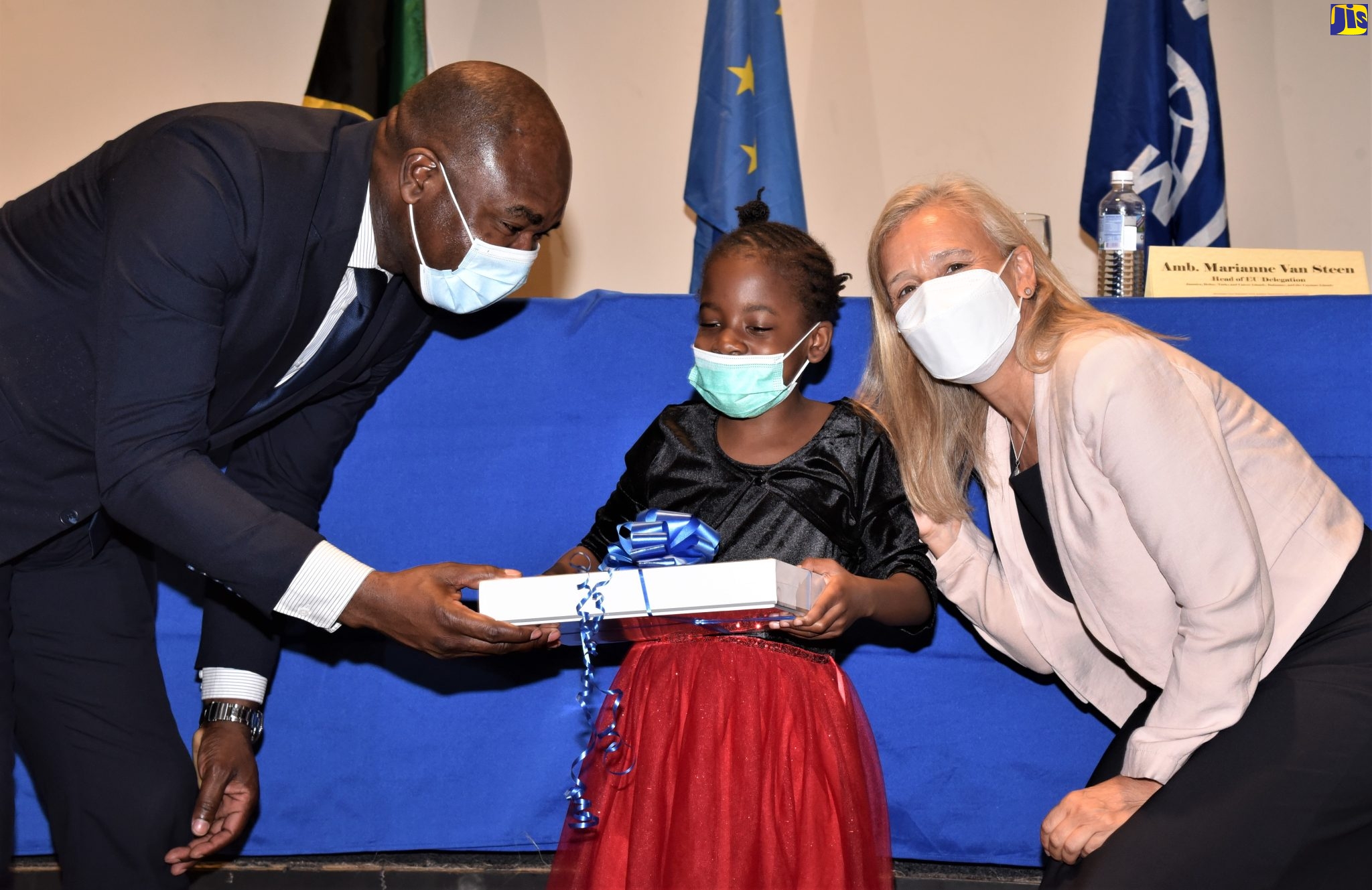 Minister of State, Ministry of National Security, Hon. Zavia Mayne (left) presents Zaria Brown (centre), with her award for placing first in the 6-8 age group category of the ‘Stop Human Trafficking’ visual and performing arts competition. The awards ceremony was held at the Jamaica Pegasus Hotel in Kingston on January 22. Looking on is Head of the European Union...
