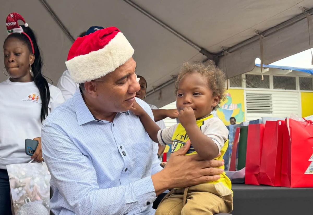 Prime Minister, Dr. the Most Hon. Andrew Holness interacts with a young child at a Christmas kiddies treat at the Middle Quarters Primary and Infant School in St. Elizabeth, on December 13.