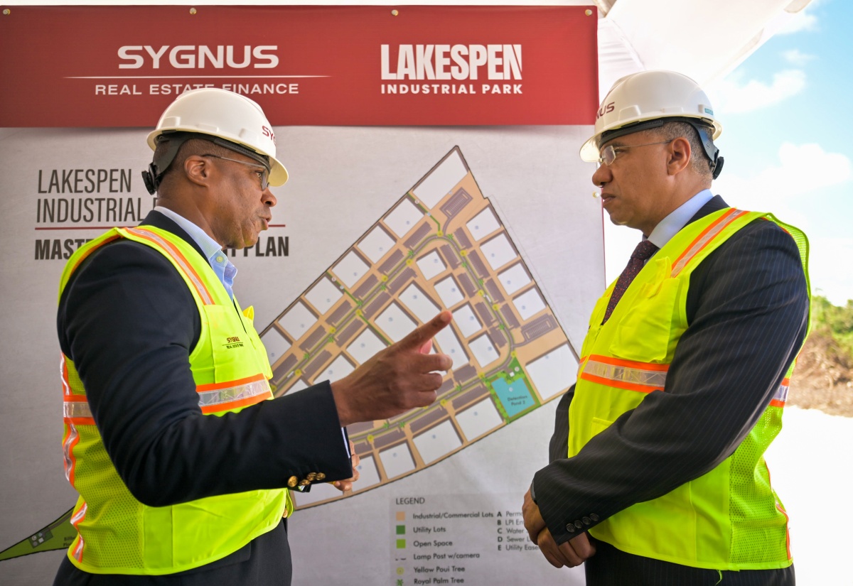 Prime Minister, Dr. the Most Hon. Andrew Holness (right), in discussion with Vice President and Head of Real Estate and Project Finance, Sygnus Capital, David Cummings, during the official ground-breaking ceremony for the US$20-million Lakes Pen Industrial Park in St. Catherine on Tuesday (December 9).