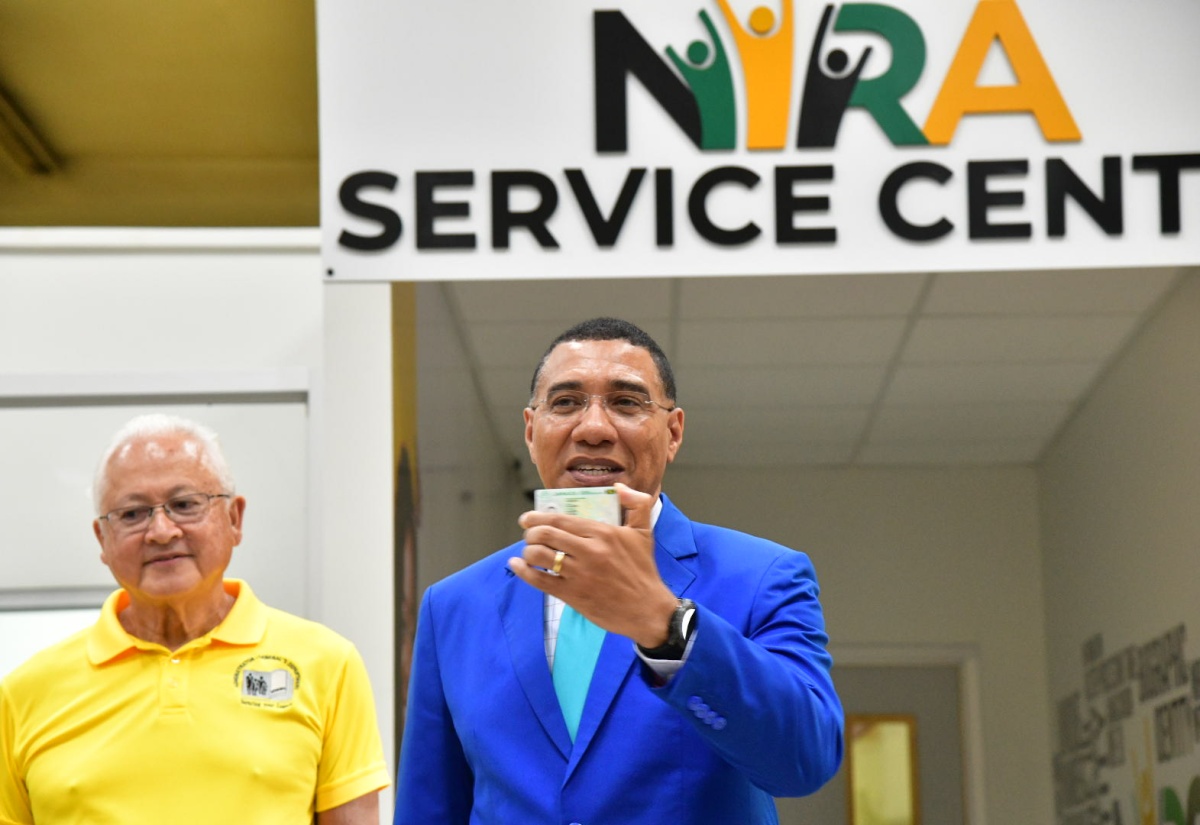 Prime Minister, Dr. the Most Hon. Andrew Holness (right), displays his national identification card during the official launch of the National Identification Registration Authority (NIRA) at the NIRA Centre, Central Sorting Office (CSO) in Kingston on Friday (November 15). Looking on is Minister of Justice, Hon. Delroy Chuck.