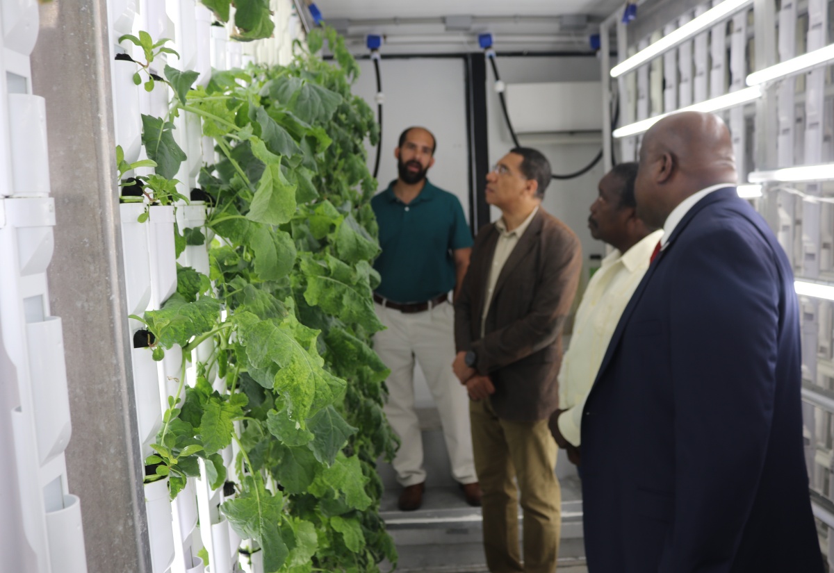 Prime Minister, the Most Hon. Andrew Holness (second left), observes aspects of Delaware State University’s Vertical Hydroponic Farm concept, being explained by the institution’s Agricultural Technician, Thomas Harman III (left). Prime Minister Holness visited the United States-based university on May 9. Looking on are Member of Parliament for St. Mary Western, Robert Montague (second right), and the University’s Vice President, Antonio Boyle.