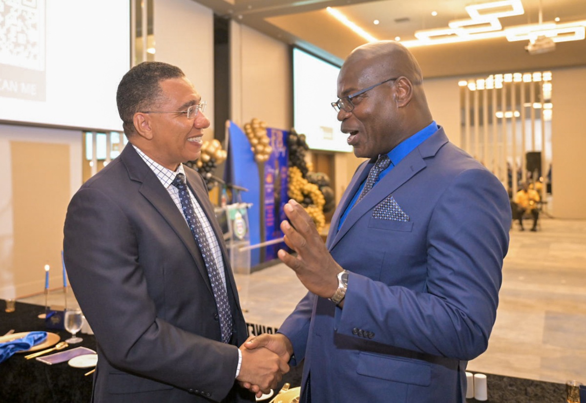 Prime Minister, the Most Hon. Andrew Holness (left), engages in conversation with outgoing Deputy Commissioner of Police (DCP) Fitz Bailey, at a retirement function for the veteran policeman, held on Friday (September 6), at the AC Mariott Hotel, in New Kingston.
