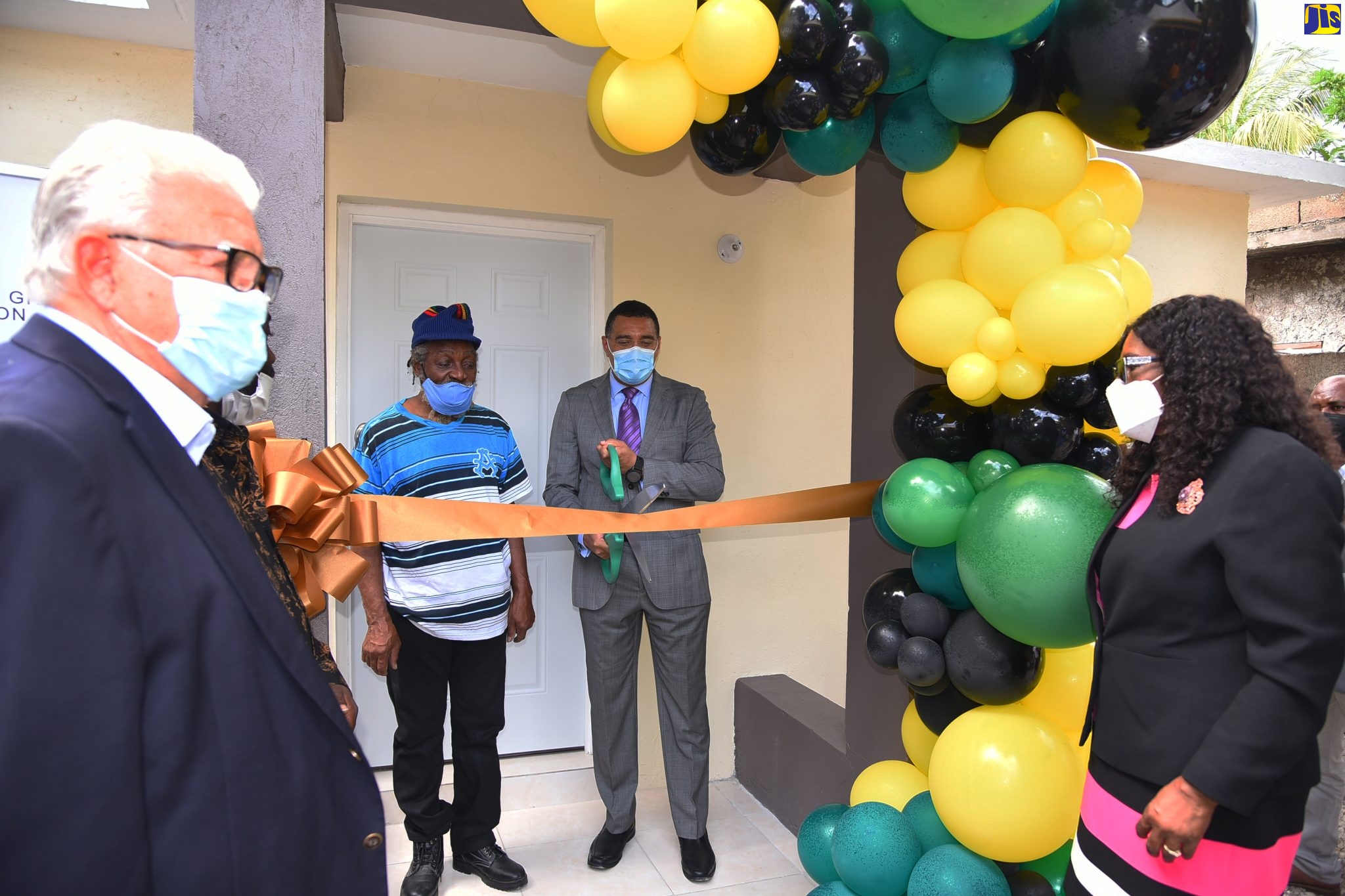 Prime Minister, the Most Hon. Andrew Holness (second right), cuts the ribbon to hand over a three-bedroom house to Henry Dwyer (second left) at Donmair Close in St. Andrew North Central, on February 16. The unit was built under the New Social Housing Programme. Sharing the moment (from left) are Minister of Labour and Social Security and Member of Parliament for the area, Hon. Karl Samuda; and Permanent Secretary in the Ministry of Economic Growth and Job Creation, Audrey Sewell.