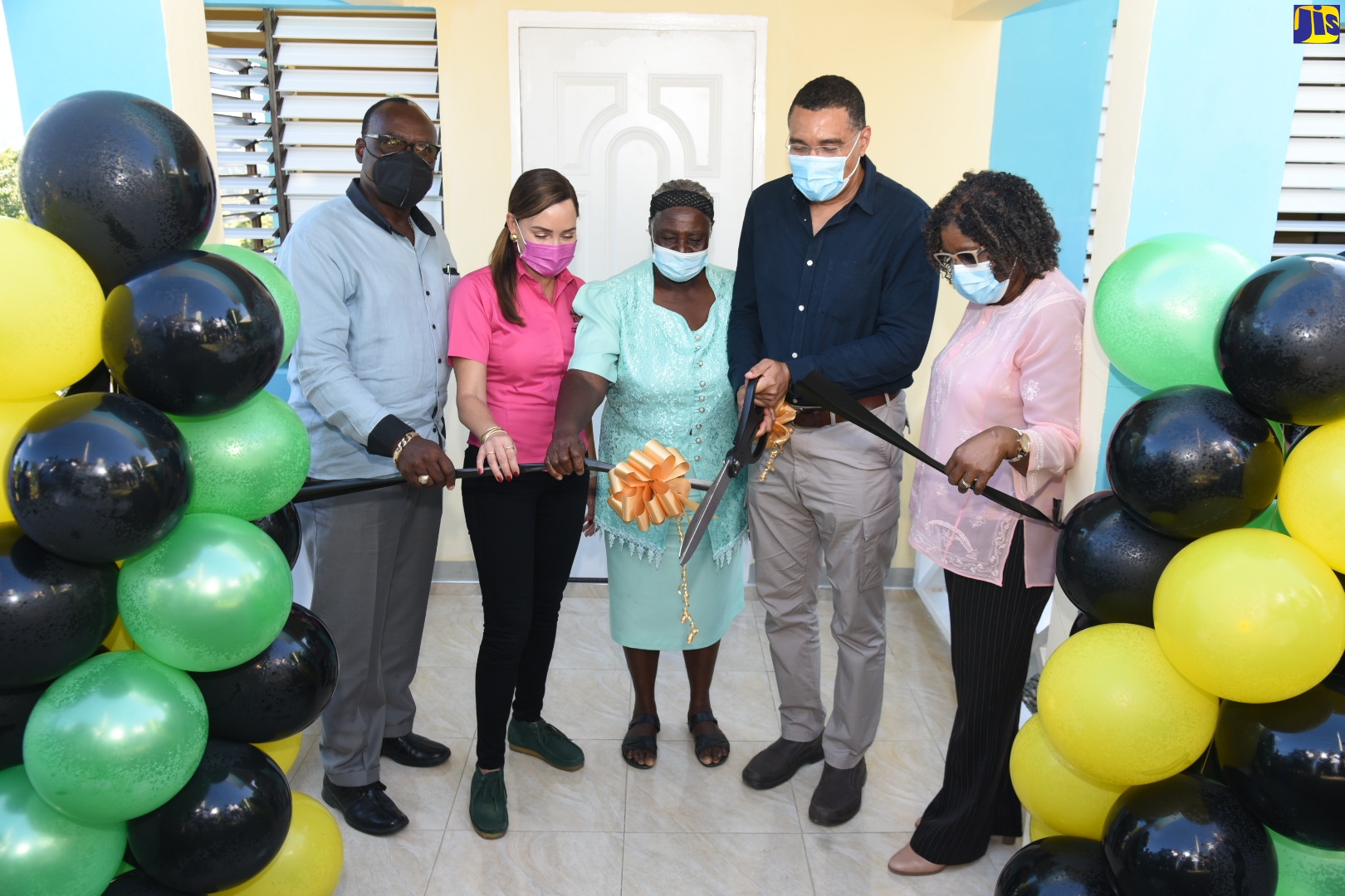 Prime Minister, the Most Hon. Andrew Holness (second right), cuts the ribbon at the handover of a three-bedroom unit in Shot Over, Port Antonio, Portland, recently. Sharing the moment (from left) are Mayor of Port Antonio, Paul Thompson; Member of Parliament for Portland East, Ann-Marie Vaz; mother of the beneficiary, Brenda Thompson, and Permanent Secretary at the Office of the Prime Minister (OPM), Audrey Sewell.