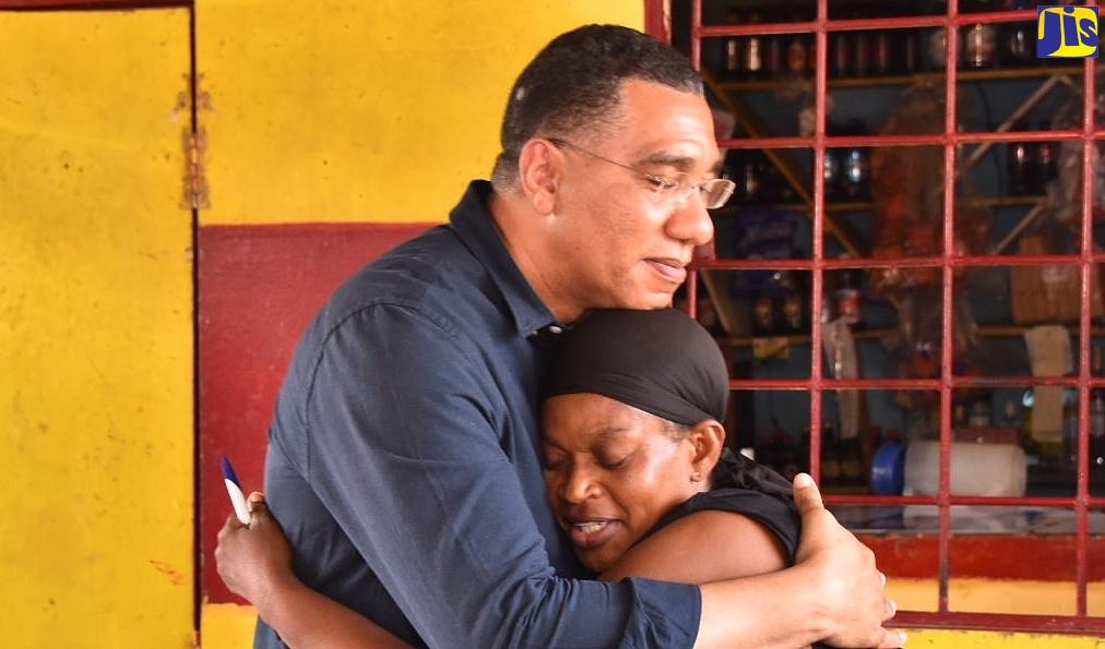 Prime Minister, the Most Hon. Andrew Holness (left), consoles Gwendolyn McKnight, mother and grandmother of slain Clarendon family, during a visit to her home in the parish on Friday (July 1).