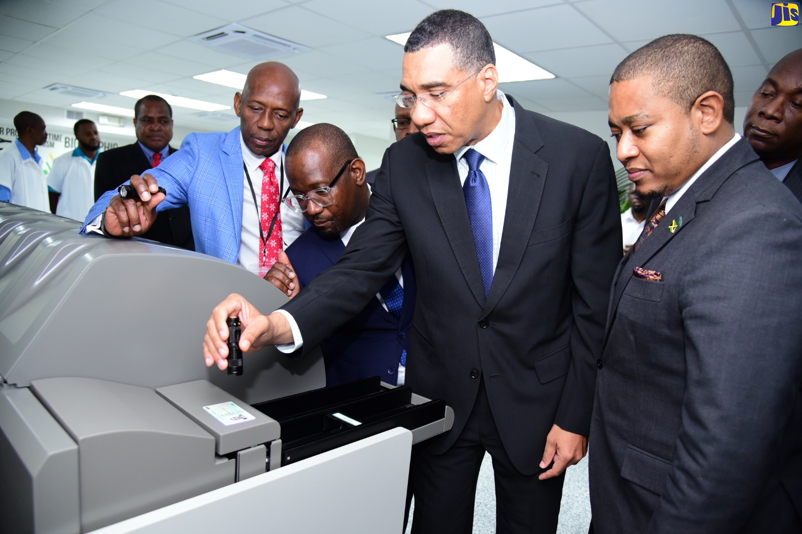 Prime Minister, the Most Hon. Andrew Holness (second right), examines the security features of his newly printed national identification card. Occasion was a tour of the Card Personalisation Centre located at the Jamaica Post Central Sorting Office in Kingston on Tuesday (December 13). Others (from left) are Member of Parliament, St. Catherine North Eastern, Hugh Graham; Programme Director, National Identification System (NIDS), Dr. Warren Vernon; and Minister without Portfolio in the Office of the Prime Minister, Hon. Floyd Green.