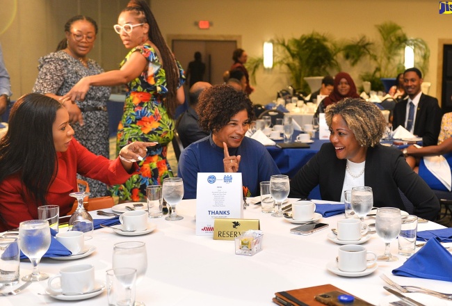 Minister without Portfolio in the Office of the Prime Minister with oversight for Skills and Digital Transformation, Senator Dr. the Hon. Dana Morris Dixon (right), converses with Managing Director, HEART/NSTA Trust, Dr. Taneisha Ingleton (left), and Chair, Private Sector Organisation of Jamaica (PSOJ) Human Capital Development Committee, Maya Walrond (centre). The occasion was the PSOJ’s Business Forum held at The Jamaica Pegasus hotel in New Kingston on Tuesday (July 18).