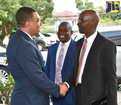 Prime Minister, the Most Hon. Andrew Holness (left), shakes hands with President of the Jamaica Union Conference of Seventh Day Adventists and Chairman of Andrew’s Memorial Hospital (AMH), Pastor Everett Brown, during the institution’s 80th anniversary thanksgiving church service on Saturday (April 6). The service was held at Andrew’s Memorial Seventh Day Adventist Church in Kingston. Looking on is the hospital’s President and Chief Executive Officer, Donmayne Giles.