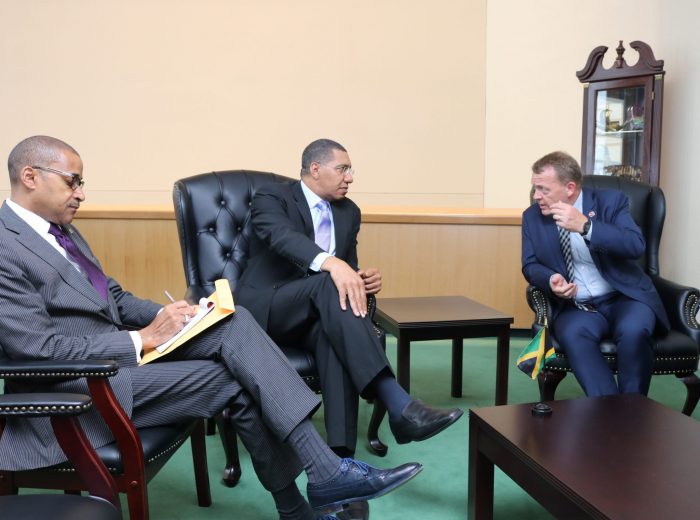 Prime Minister, the Most. Hon. Andrew Holness (centre), converses with Denmark’s Prime Minister, Lars Lokke Rasmussen (right), during bilateral talks at the United Nations Headquarters in New York on Tuesday (September 25). At left is Jamaica’s Representative to the United Nations, Ambassador Courtenay Rattray.