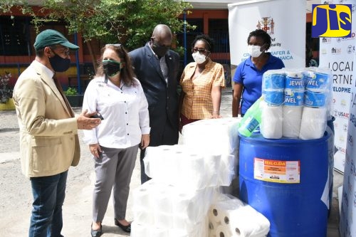 National Security Minister, Hon. Dr. Horace Chang (second left), and Member of Parliament for South West St. Andrew, Dr. Angela Brown Burke (left), look at a bottle of cleaning solution, which was among sanitisation products donated by the United States Agency for International Development (USAID) to Cockburn Gardens Primary and Junior High School for its summer programme. The handover took place at the school in Kingston on July 15. Also pictured are USAID Country Representative, Jason Fraser (third right); Principal of the school, Dr. Patricia Kinglocke Findley (second right) and USAID representative, Morana Krajnovic.