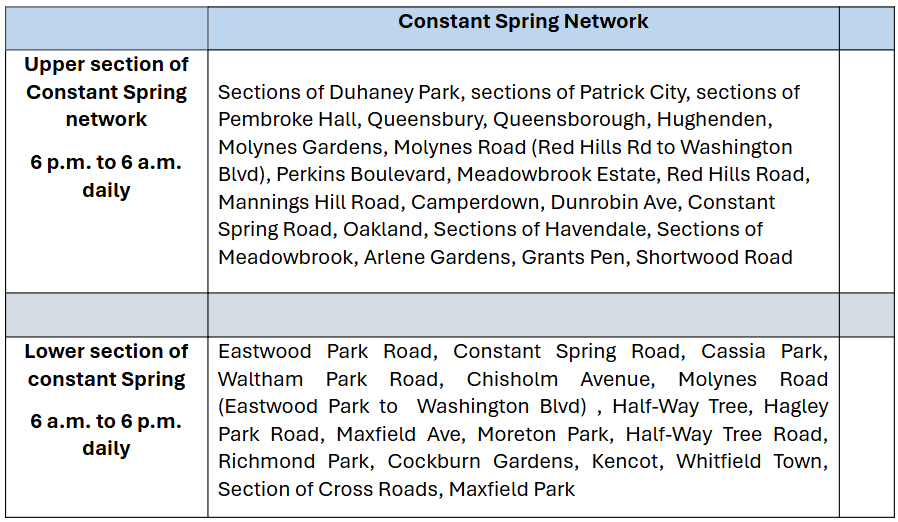 Water Supply Schedule for Constant Spring Network – Effective July 23, 2025