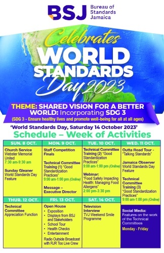 Official flyer for the schedule of activities that will be undertaken by the Bureau of Standards Jamaica in recognition of World Standards Day (October 14) 2023.